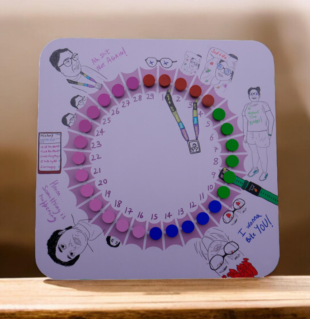 Log your cycle daily with colored magnetic markers. Whether your cycle shifts or stays regular, unlike others, this tracker adapts to you.